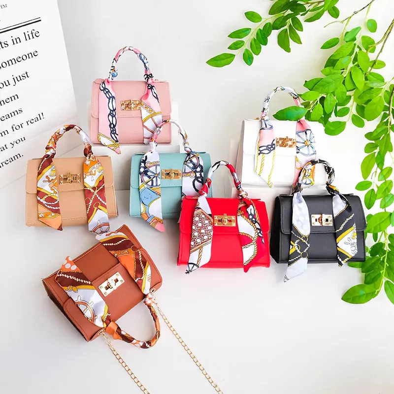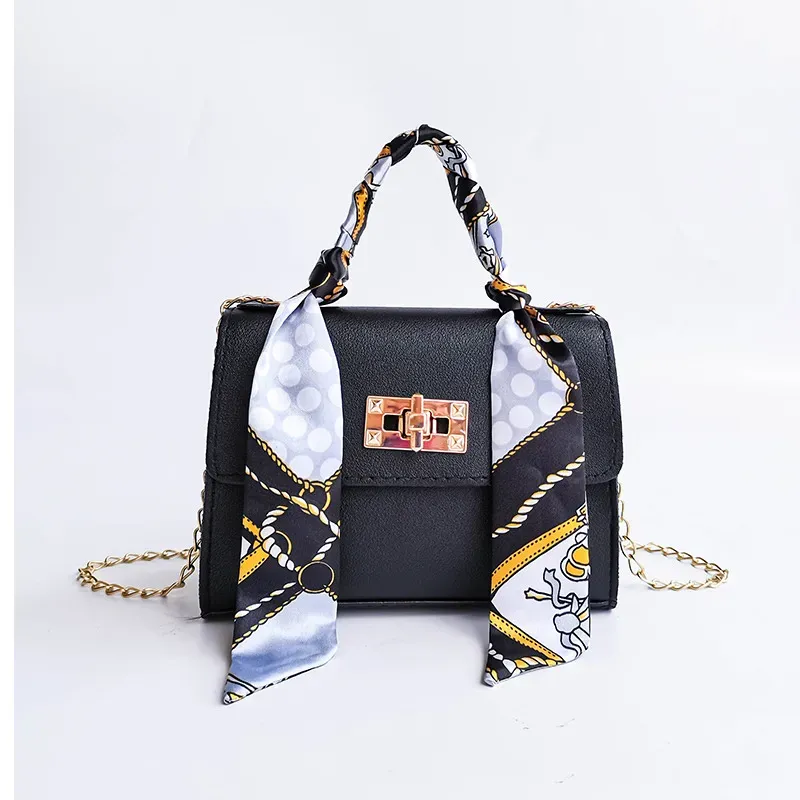 Women Elegant Flap Buckle Design Silk Scarf Decoration Solid Color PU Crossbody Bag